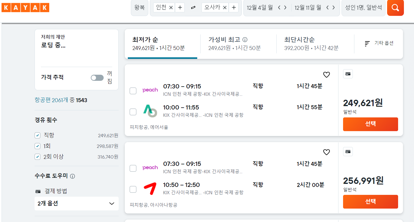 마지막으로 소개해드릴 저렴한 항공권 비교사이트는 카약입니다. 카약도 네이버항공권과 유사한 검색 방식을 가지고 있어 검색이 편리한 장점이 있습니다.