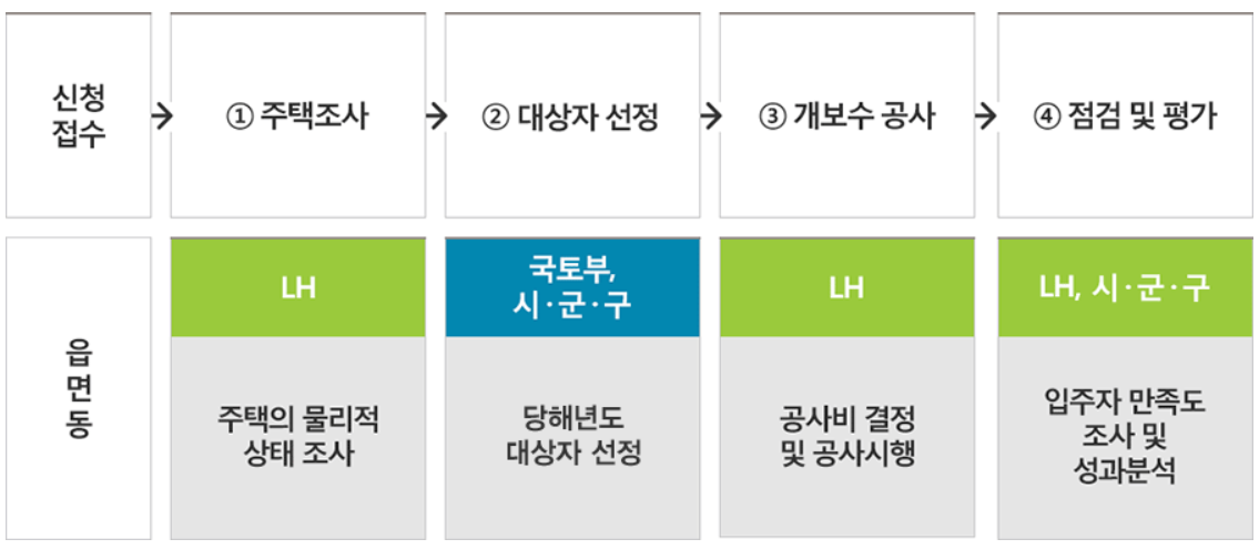 주택 등을 소유하여 그 집에 거주하고 있는 자가 가구의 경우는 주택의 노후도를 평가하여 종합적인 주택개량을 지원받을 수 있습니다.