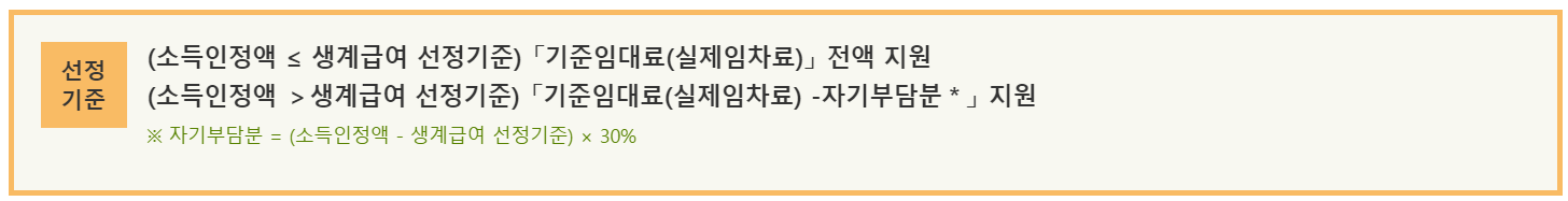 - 수급자의 소득인정액이 생계급여 선정기준을 초과하는 경우 자기 부담분이 차감됩니다.