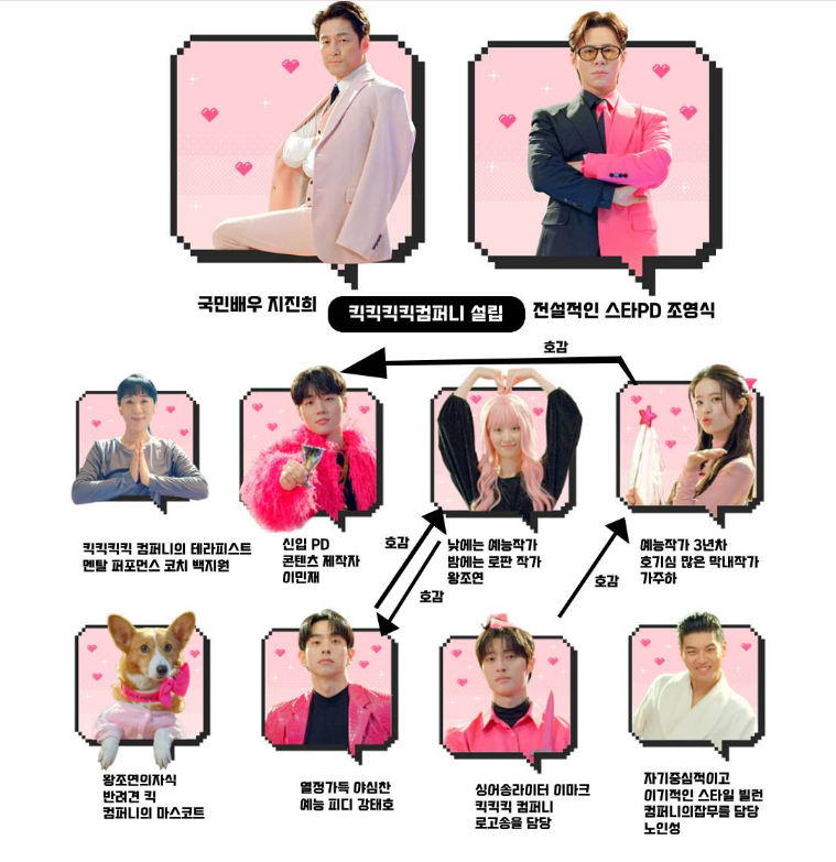 킥킥킥킥 인물관계도를 살펴보면 킥킥킥킥 컴퍼니를 기준으로 배우와 피디 그리고 컴퍼니 직원들의 좌충우돌 에피소드가 그려지는 구성입니다.