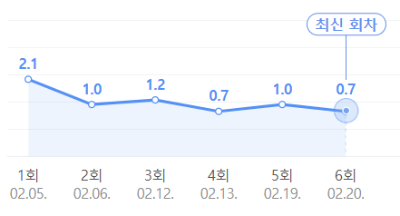 1회차 2.1%로 시작한 시청률이 현재는 1프로 미만으로 저조한 성적이지만 회차가 지속 될수록 화제성에서는 가능성이 있지 않을까 싶습니다.